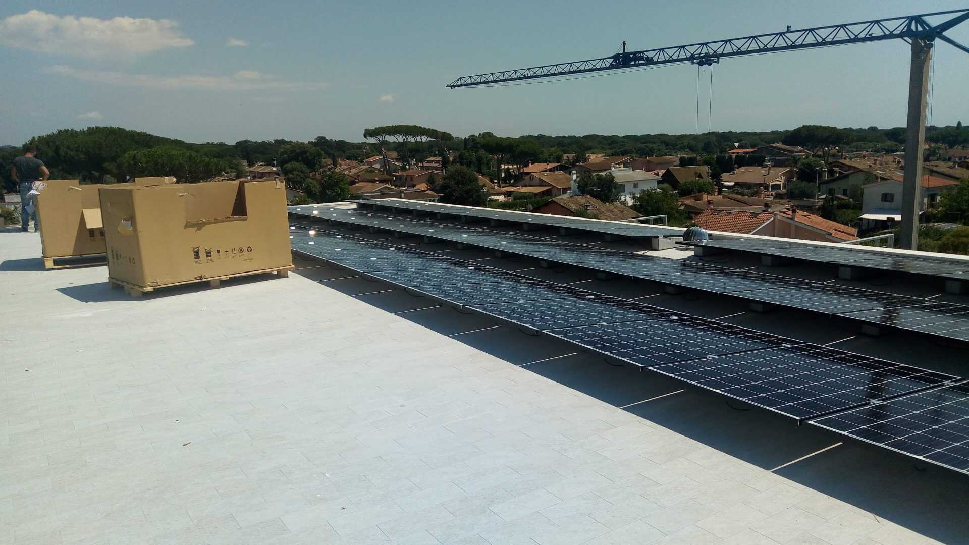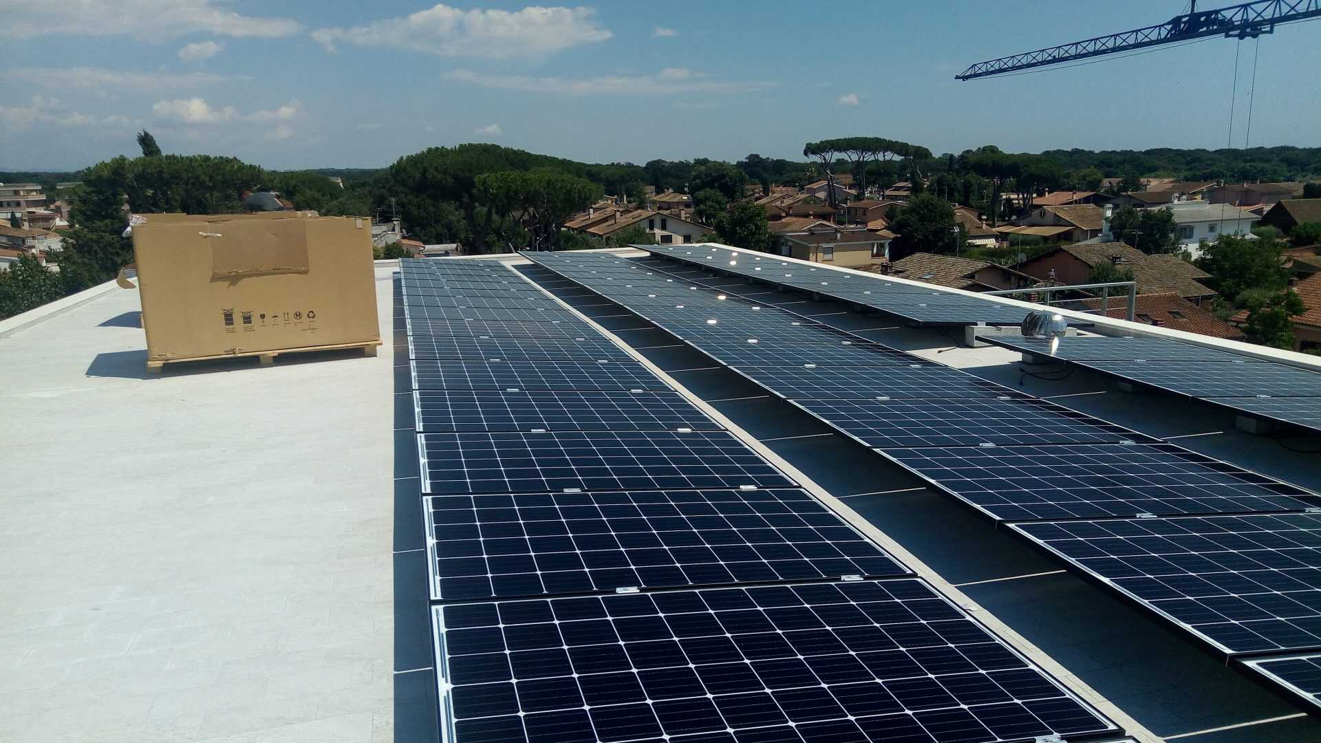 I classici pini tipici della città eterna fanno da contorno a questo impianto fotovoltaico con vista sulla capitale italiana. La struttura è realizzata con delle zavorre 5° che sono posate in verticale senza la necessità di forare la copertura, evitando in questo modo possibili infiltrazioni o danni al tetto.