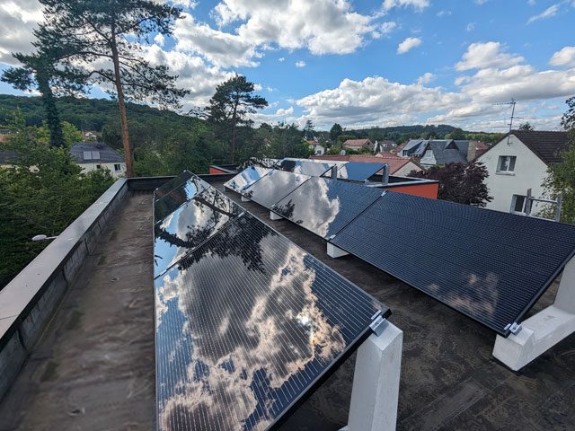 Questo impianto fotovoltaico da 6 kW è stato realizzato a Saint-Rémy-lès-Chevreuse (Francia) dal nostro cliente Sovexis su un tetto piano in guaina, e grazie alle strutture per fotovoltaico Sun Ballast il montaggio è stato eseguito in modo semplice e veloce, senza apportare alcun danno alla copertura dell’edificio.
