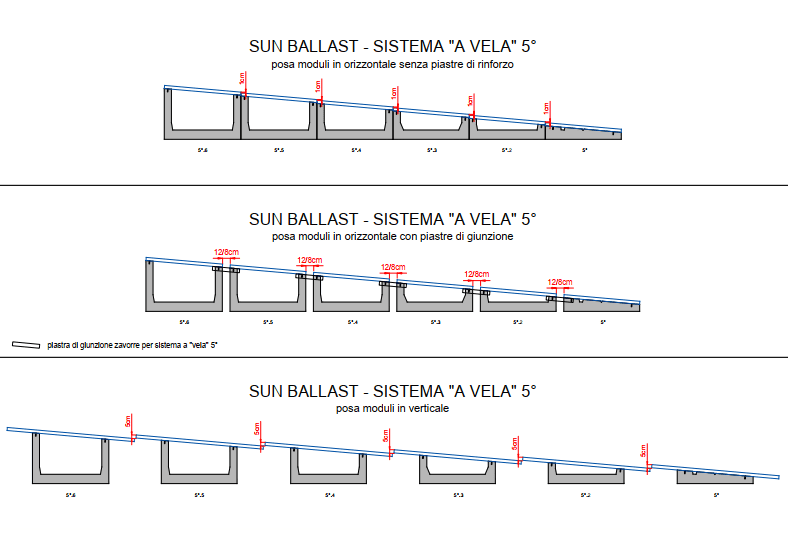 Le strutture Sun Ballast che meglio rispondono a questa necessità sono sicuramente quelle del Sistema a Vela Sun Ballast, questo specifico sistema permette di installare fino a sei file di pannelli senza la necessità di lasciare spazio tra di essere.