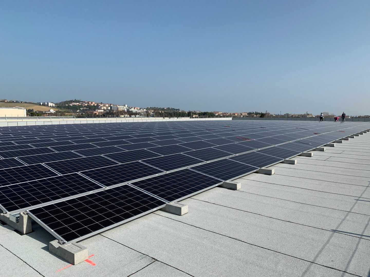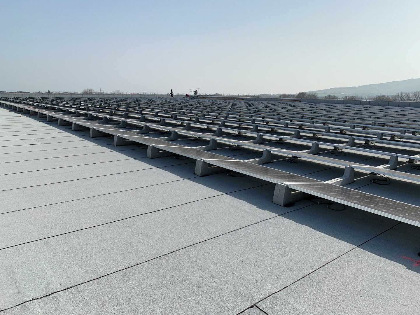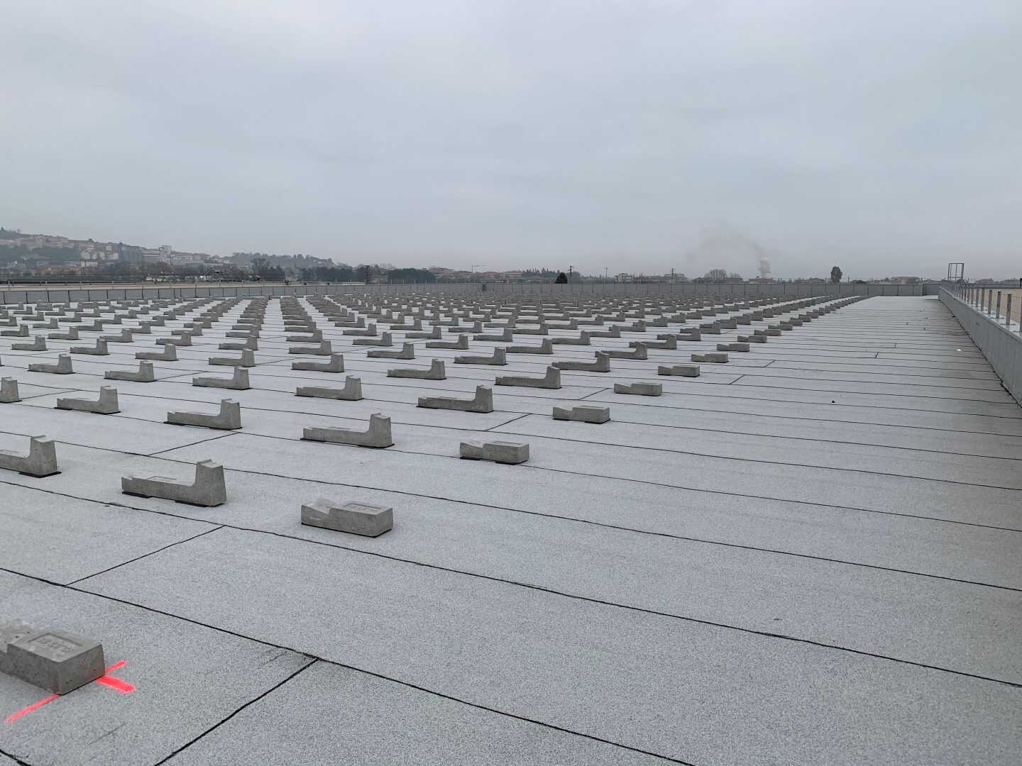 Un imponente struttura fatta con le zavorre del sistema Connect che non hanno bisogno di essere fissate sulla copertura per essere installate. Questo ha il vantaggio di rendere facile e veloce l’installazione dell’impianto ma anche di non dover fare fori con rischio di avere infiltrazioni.