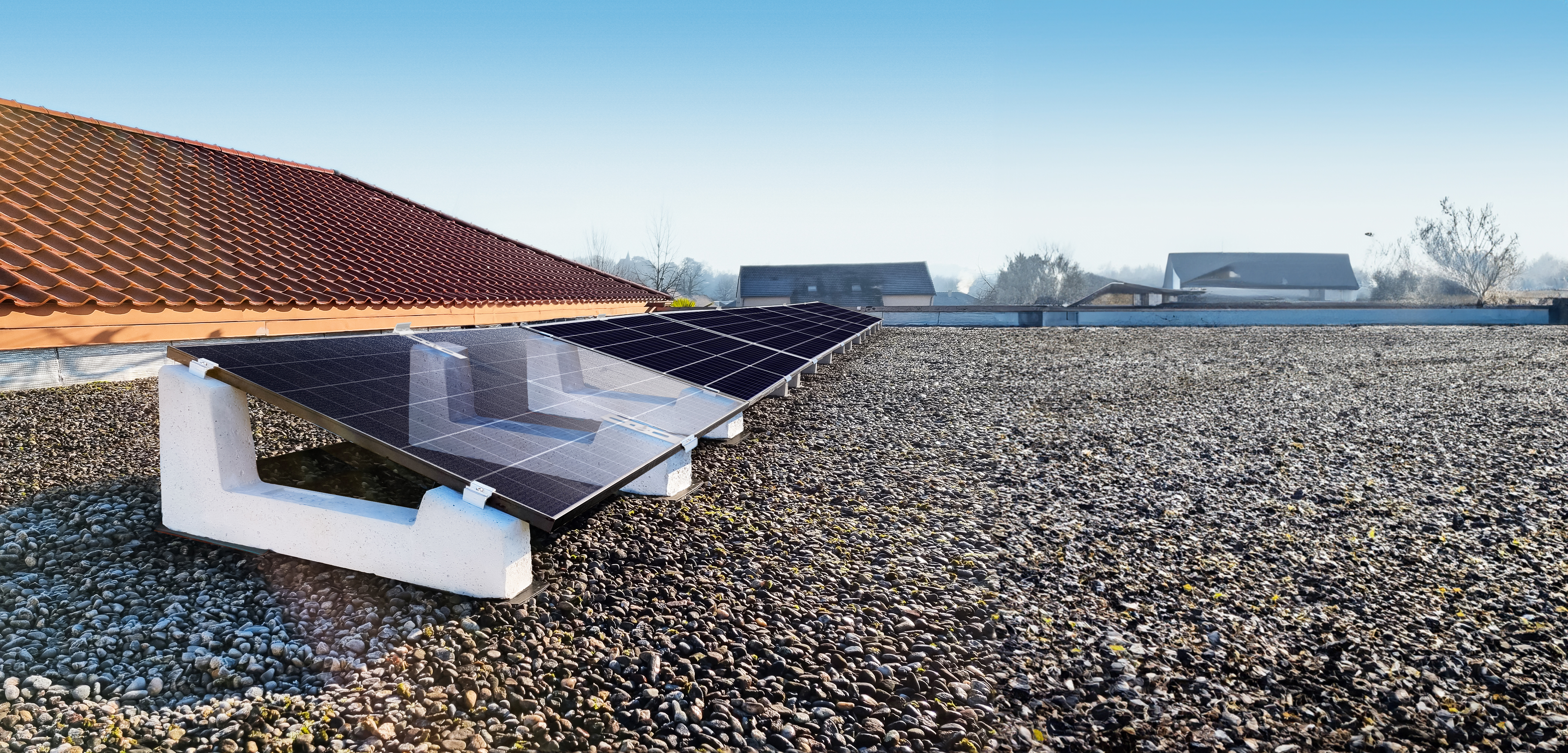 In fact, the Standard system-here used in the 10° version-ensures quick and easy installation on any type of flat surface, and since it does not require any fasteners, it allows for rapid progress even with delicate roofing such as sheathing and flooring. The possibility of adjusting both the length and the distance between rows also makes it possible to adapt the configuration of the system to that of the roof, easily bypassing obstacles and optimizing the available surface area.