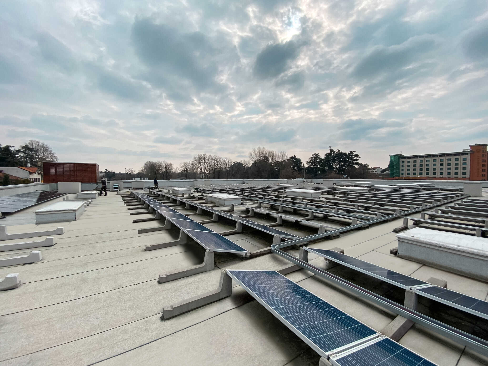 Many industrial buildings have large and spacious flat roofs, and the photovoltaic systems installed on these surfaces often reach remarkable powers: the one mounted by Esse Solar on this building in Varese reaches in fact well 200KWp, a very high level of productivity obtained also thanks to the collaboration with the Sun Ballast Technical Office: for these large plants it is in fact essential that the dimensioning calculations are performed with precision and professionalism, that the load limits are carefully respected, and that the final system ensures high levels of reliability and efficiency.
