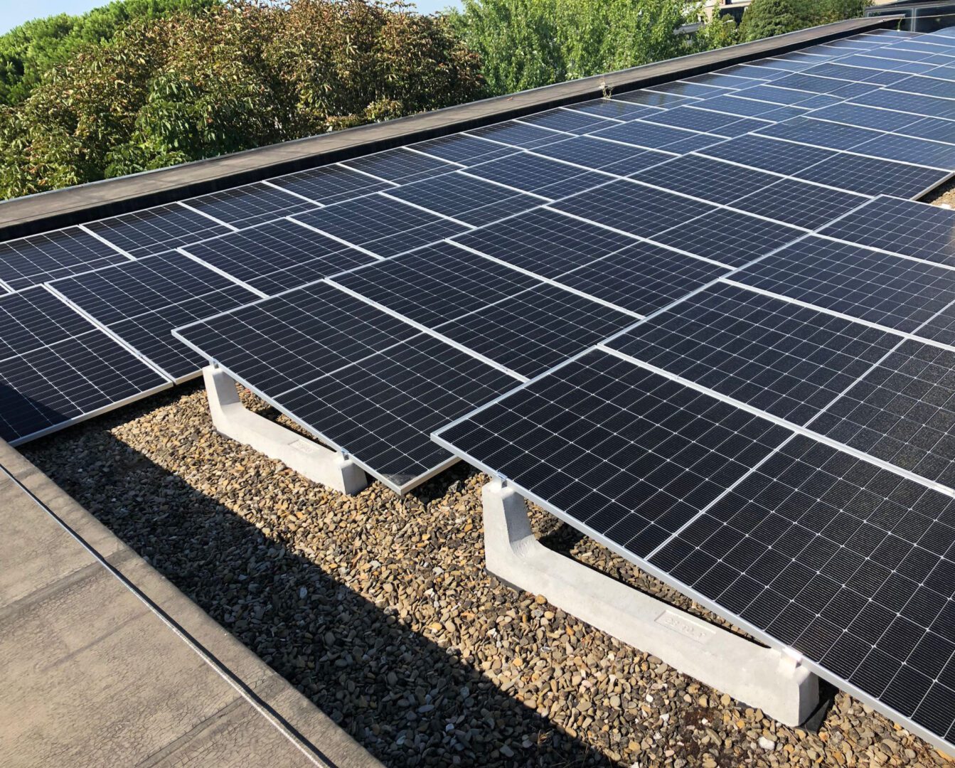 This 40 kWp flat-roof photovoltaic system was installed by our client, O.E.M.A., in Forlì. The use of Sun Ballast photovoltaic structures allowed for the creation of a robust and professional installation. The Mono-XL 10° system (also available with a 5° inclination) provides reliable and durable support for large modules. The photovoltaic ballasts are made from high-quality concrete, and the pre-insertion of M8 inserts within the structure ensures exceptional tear resistance.
