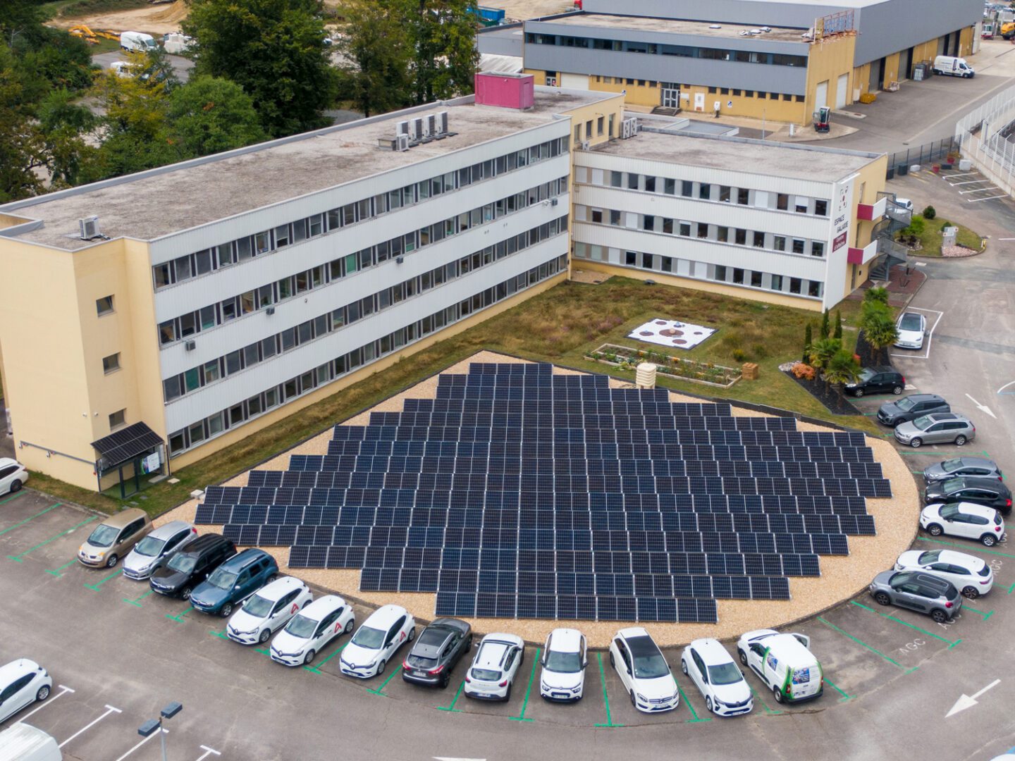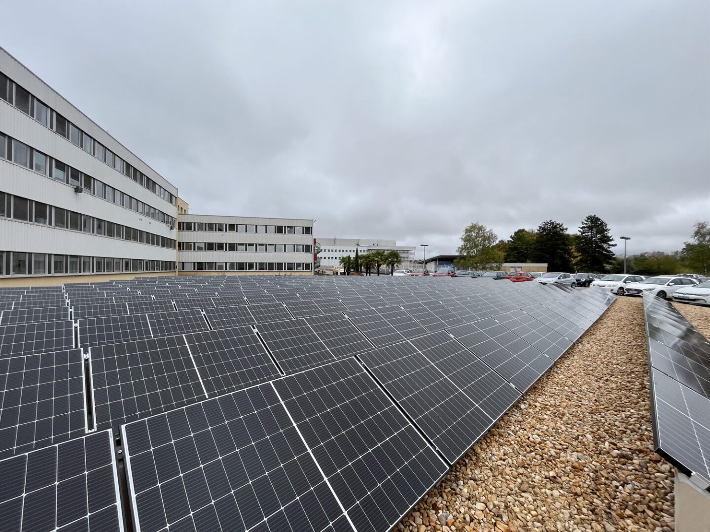 This 83 kW photovoltaic system was installed by our customer SAS Pôle-EnR in the large gravel-covered yard of a building in Limoges, France. Thanks to Sun Ballast photovoltaic structures, the installation is solid, well-organized, and highly professional.