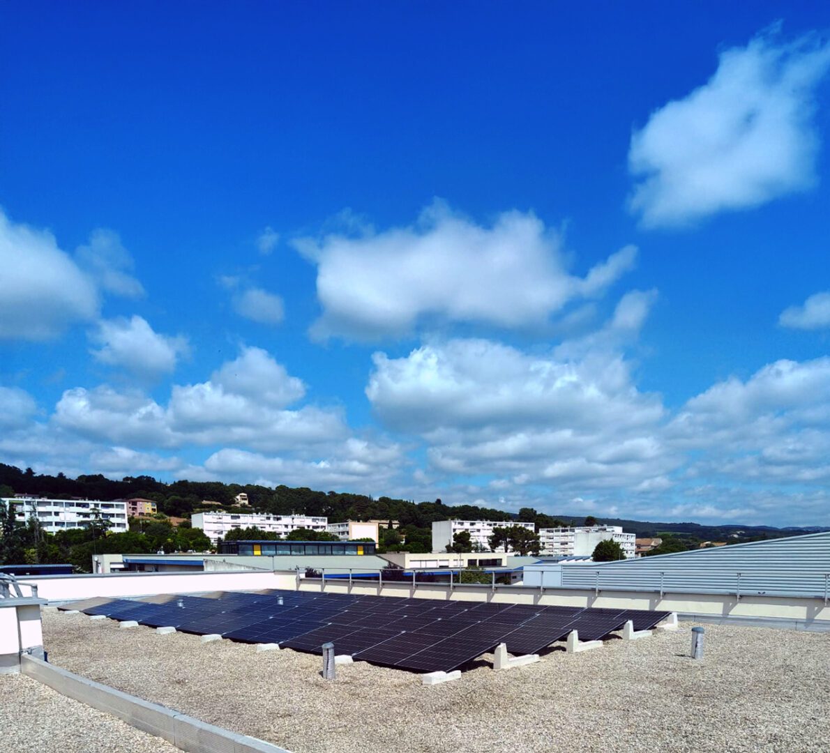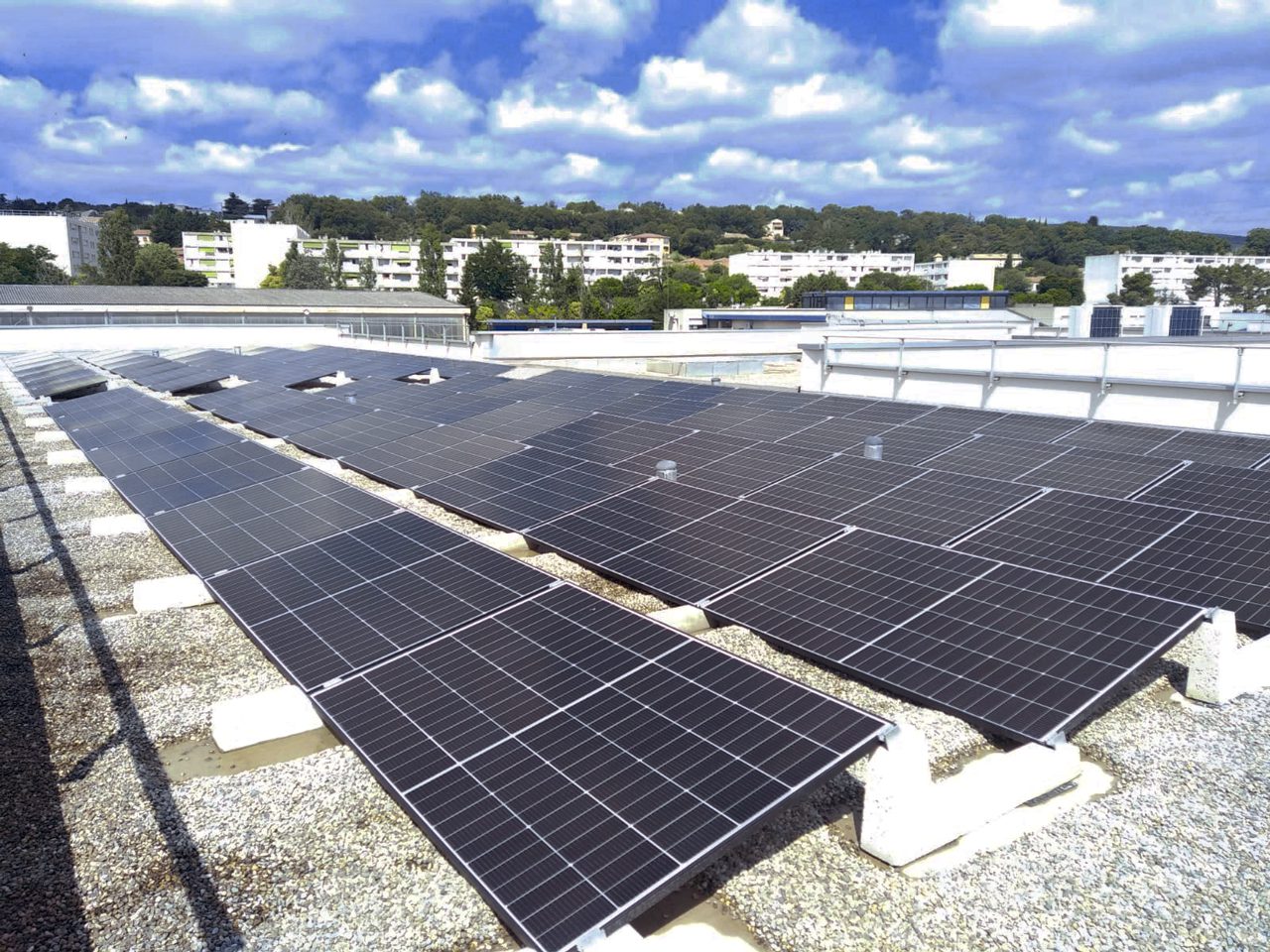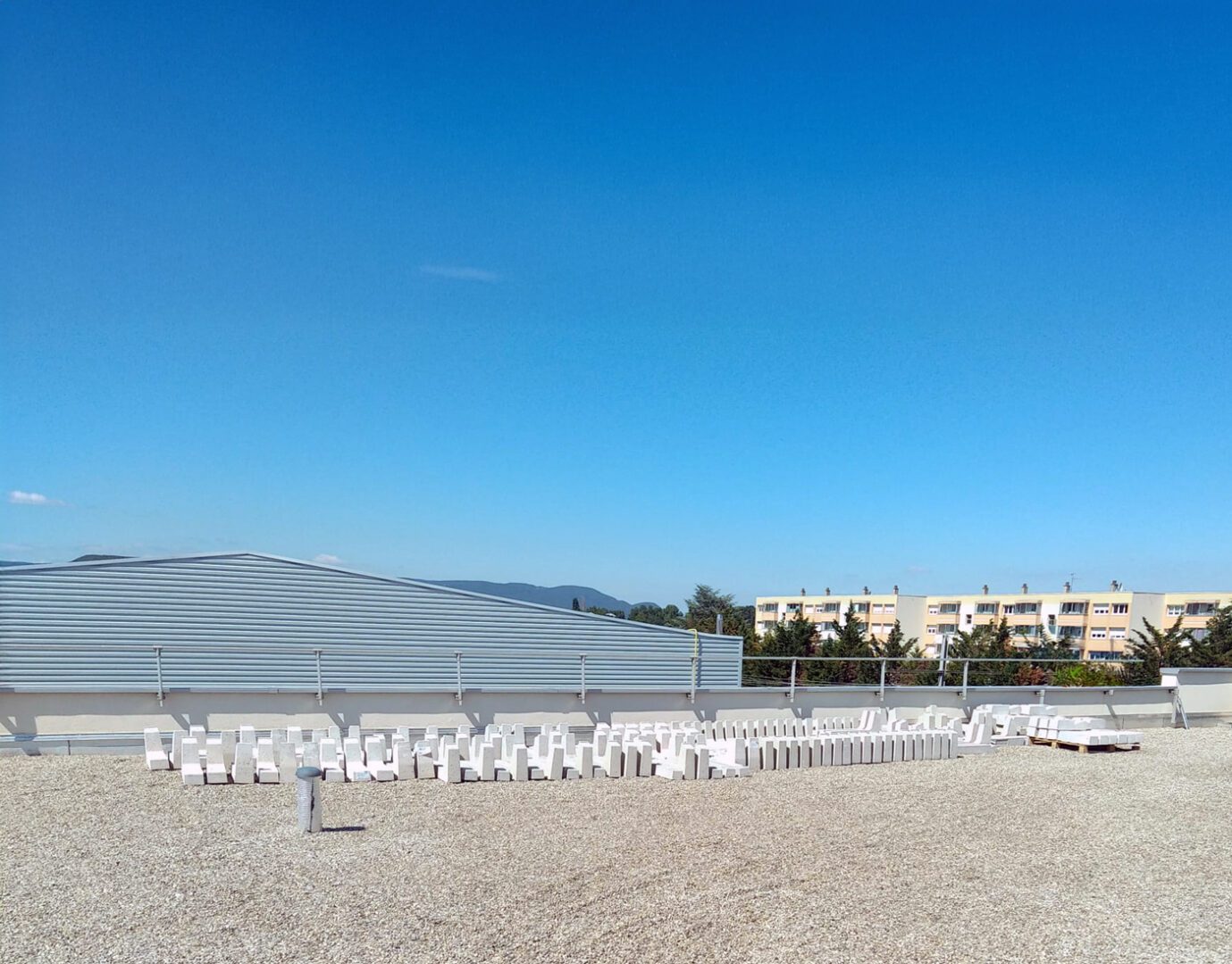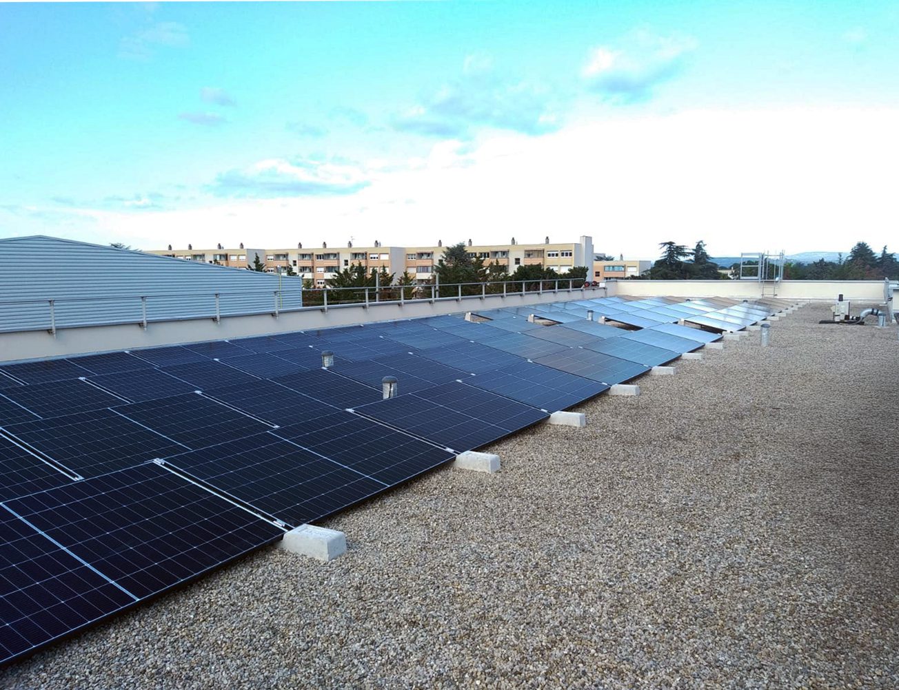 The 63 kW photovoltaic plant shown in the photo was installed in France on a gravel roof using the Connect 15° mounting system. This reticular structure – where each row is structurally connected to the previous and the next – allows for optimal weight distribution/loads across the entire network of concrete ballasts, thus avoiding roof overloads and ensuring high stability under various atmospheric stress conditions.