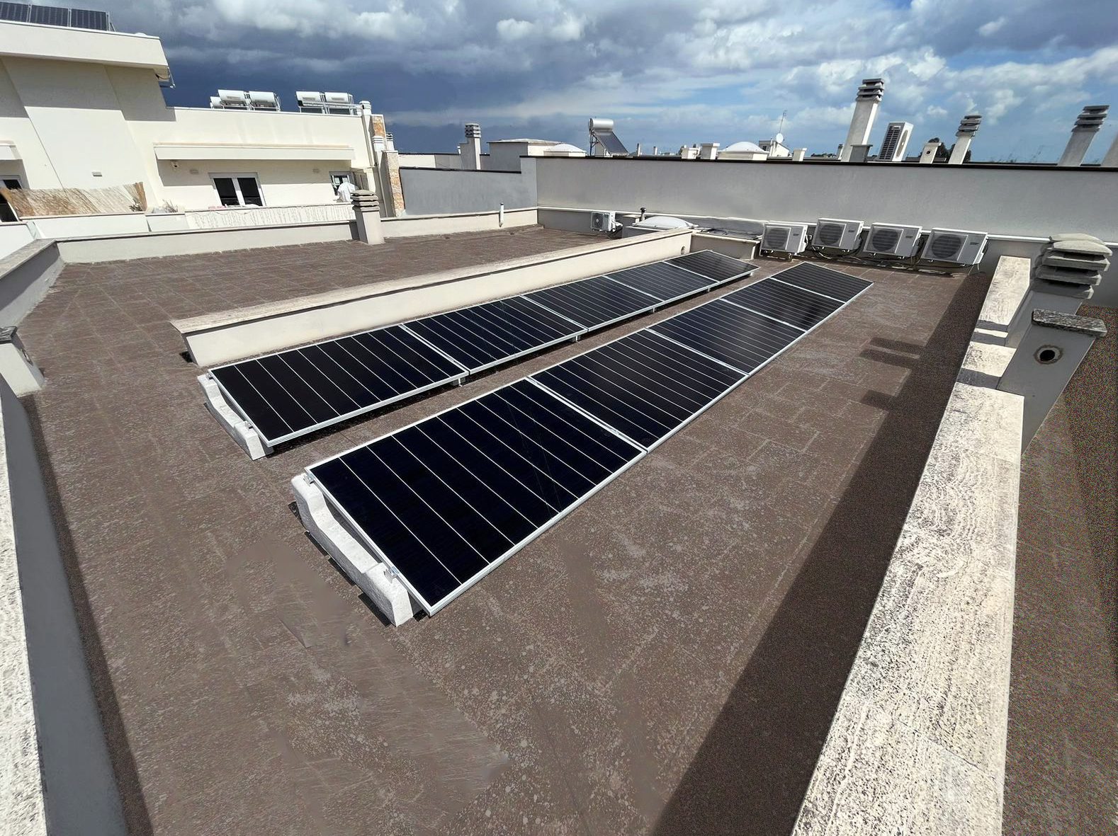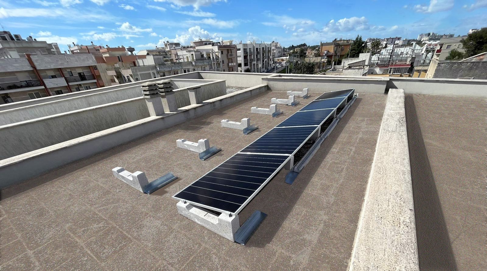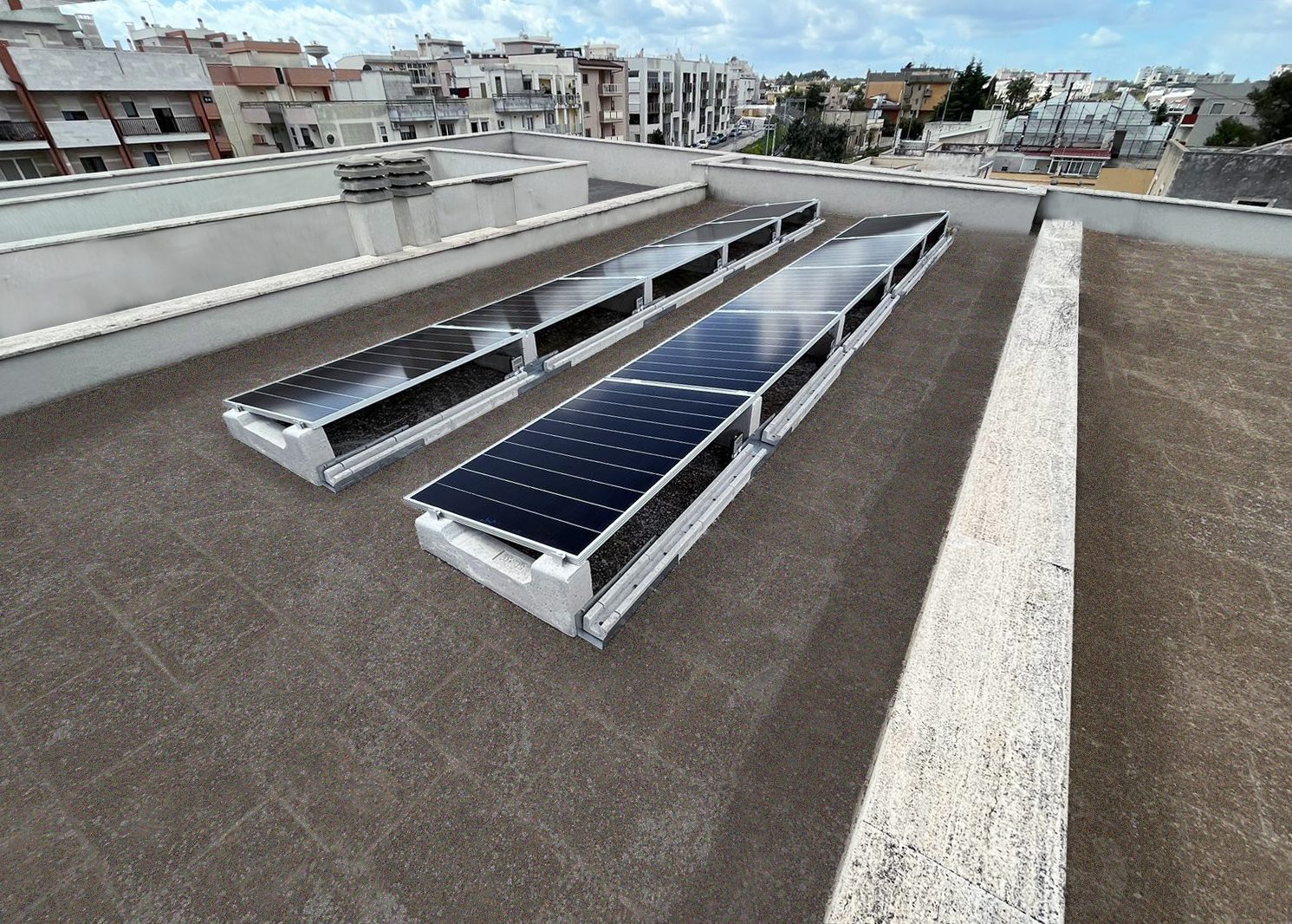The one created by Solarvolt on this paved roof generates 4 kWp of renewable energy, and the installation of the support structures was carried out very quickly: the Sun Ballast ballasts do not in fact need to be fixed to the roof, and they already contain the fixing bushings.